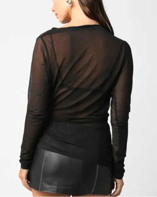 Effortlessly chic, this sheer black top is a modern staple with an edge. Designed with a soft drape across the front and flattering ruching at the waist, it creates an elegant yet bold silhouette. The lightweight mesh fabrication makes it perfect for layering over a bralette or cami for a night-out look that’s equal parts sleek and daring.