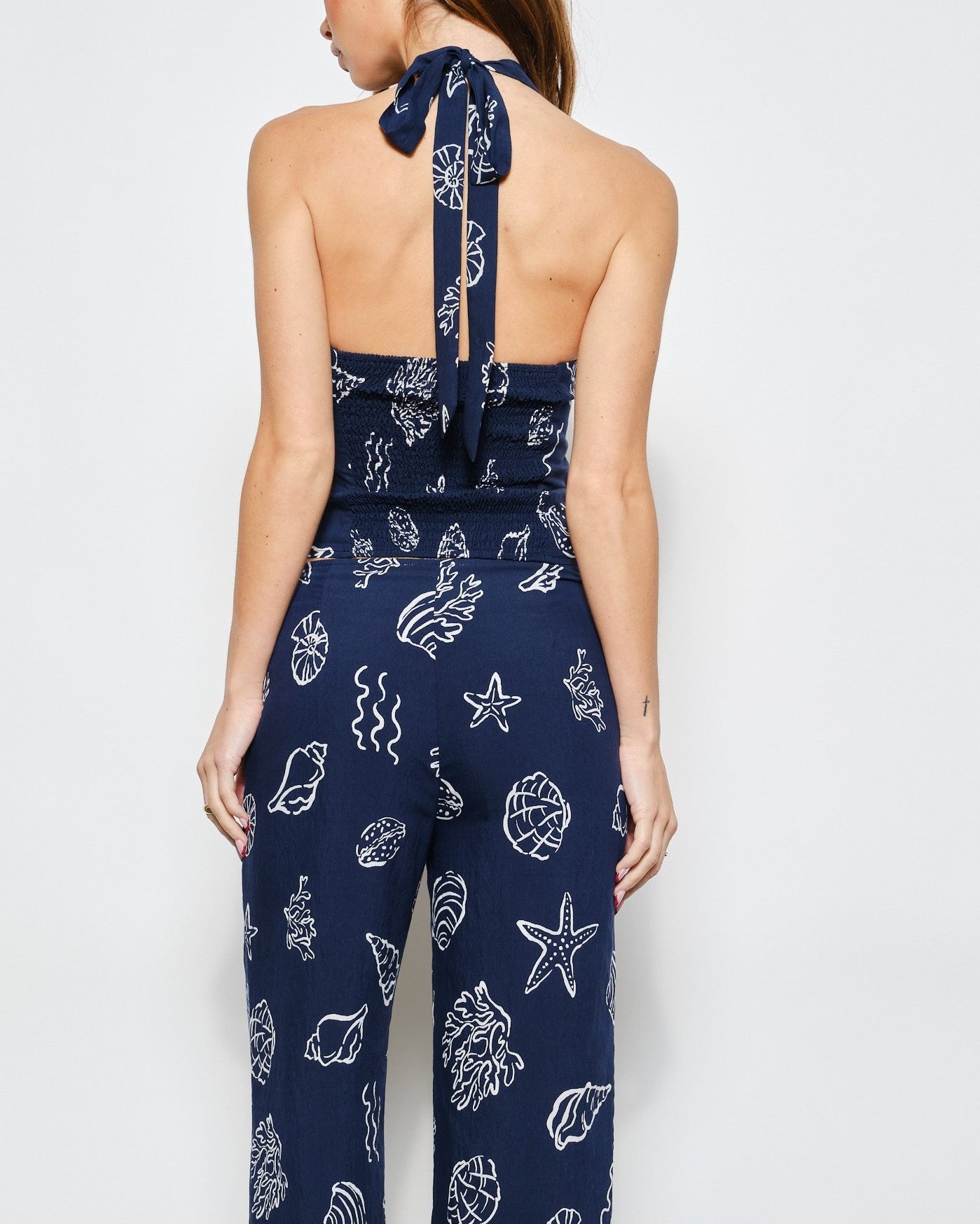 Your coastal cool-girl moment starts here. The Sammy Halter Top features a flattering plunge neckline with delicate bead detailing and an effortless open-back silhouette. Finished in a classic navy shell print, it’s the kind of piece that feels equal parts polished and beachy.