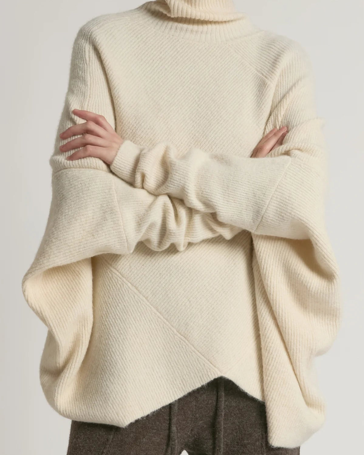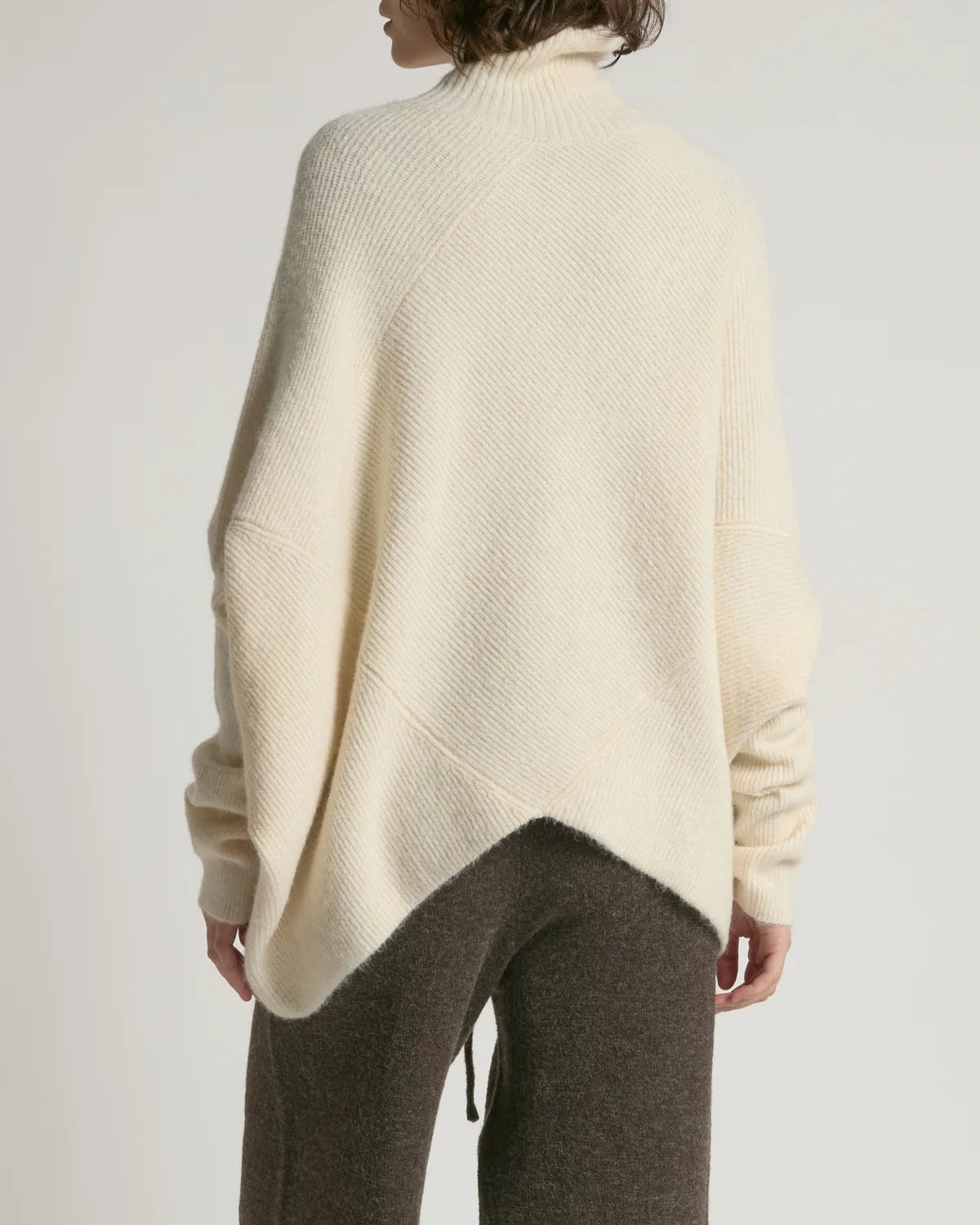 A relaxed essential with subtle details. This oversized pullover features a central V-shaped notch hem, a cozy mockneck, and dropped shoulders for effortless style. Designed as one size to comfortably fit women US 0–10, it’s an easy go-to for layering or wearing on its own.