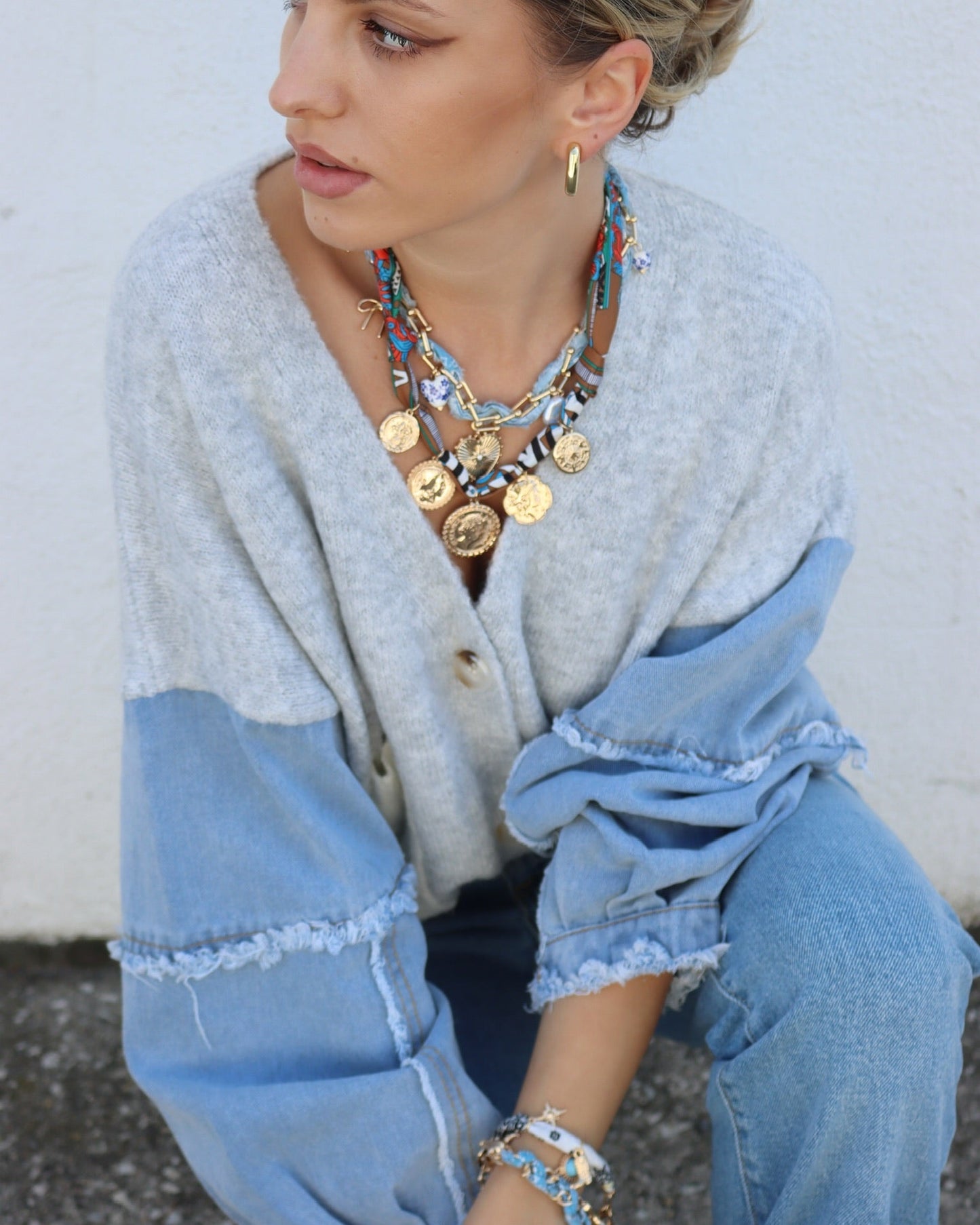 Elevate your casual wardrobe with the Celine Sweater, featuring a unique denim-inspired design blended with cozy sweater material. Detailed with raw edging and functional front pockets, this cardigan effortlessly combines style and comfort for everyday wear. Perfect for layering, it offers a relaxed yet polished look that transitions seamlessly from day to night.